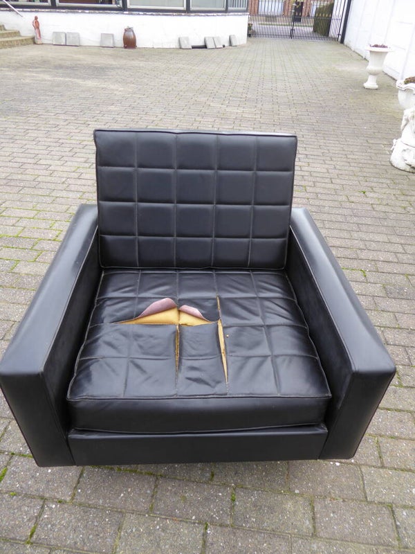 DE DRIEZIT IS IN GOEDE STAAT MAAR DE ACHTERKANT VAN DE KUSSENS MOETEN WORDEN HERSTELD. ZIJN VERSLETEN DOOR DE VEREN DIE WORDEN GEBRUIK IN DE ZETELS. DE TWEE ZITKUSSENS VAN DE ARMZETELS MOETEN WORDEN GERESTAUREERD.